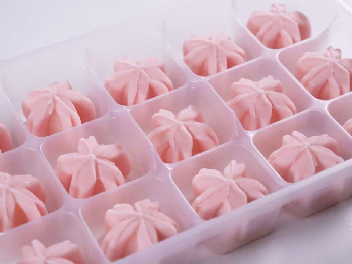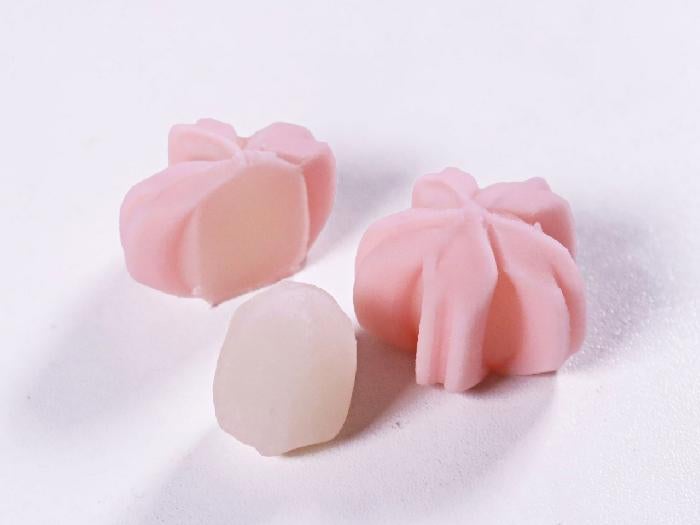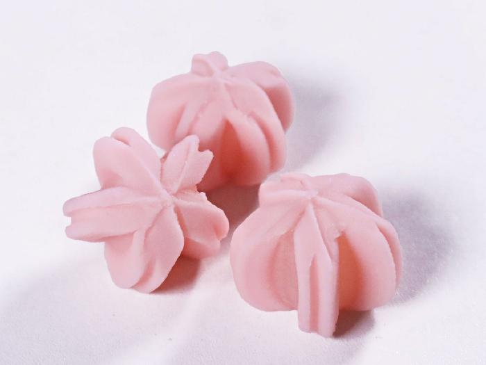 桜色の練りきりでもち菓子を包み込んだ、花型の小さめの和菓子です。春の料理や弁当に季節を添えます。