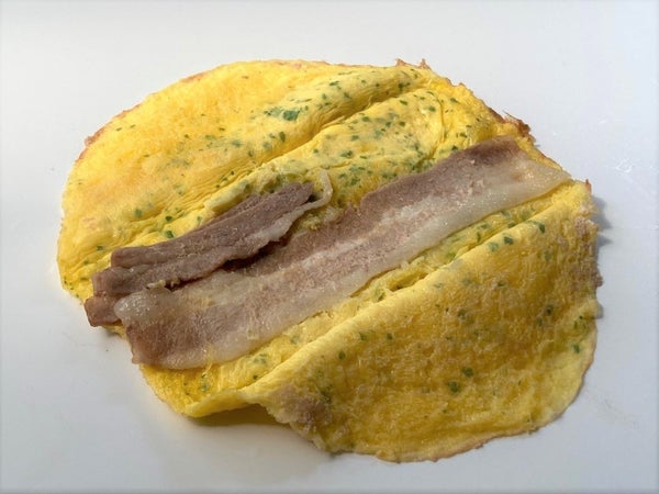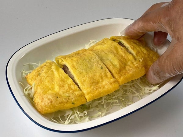 たまごの生地に豚バラ肉とねぎを入れてたたみ込んでいます。
