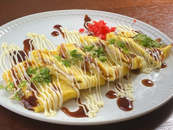 大阪名物とん平焼を簡単に。ソース・マヨネーズ・ねぎなどをたっぷりトッピングして提供するのがオススメです。