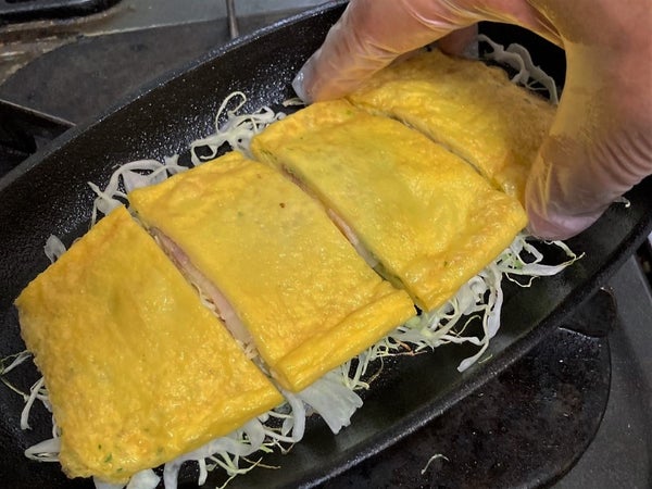 炒めた肉や野菜をたまごの生地で包む、関西の居酒屋や鉄板焼き屋では定番の料理です。一番シンプルな基本形である「たまご+豚バラ+ねぎ」の組み合わせを、1枚1枚手作業で作りました。
