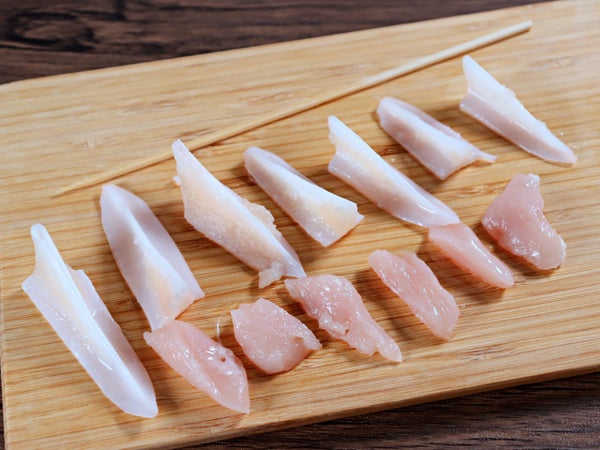 7個のヤゲンの間に鶏むね肉を刺しています。長めの18cm串。(原料個体差によって大きさや形にはばらつきがあります。)