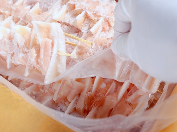 ヤゲン(むね軟骨)のコリコリした独特の歯ごたえを楽しめる軟骨串です。ヤゲンの間の肉には鶏むね肉を使用しています。原料はいずれもタイ産鶏肉、タイで製造されたものを輸入しています。