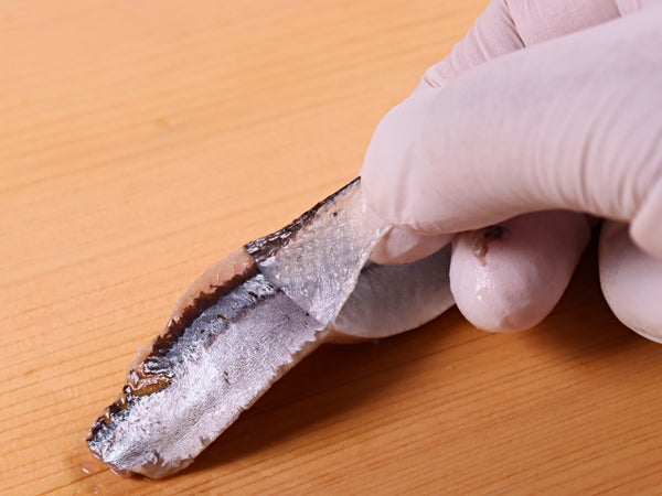 皮は簡単に引けます。身割れしないよう、ゆっくり引くのがコツです。気にならなければ皮付きのままでも。