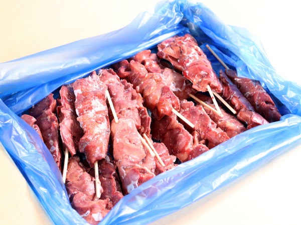薄型の段ボール入り。バラ凍結したものを入れており、ほぼ1本ずつ取り出せます。箱ごと解凍してしまうと串が崩れるので、必要分を取り出してトレーなど平面に並べて解凍してください。その際キッチンペーパーなどを敷くとドリップが取れます。