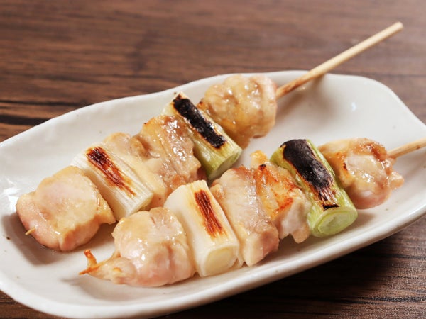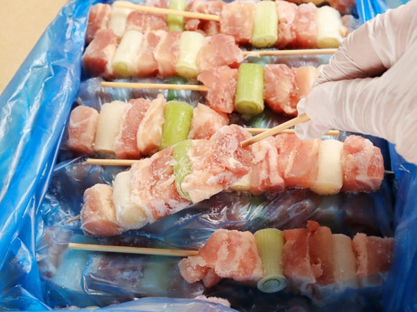 国産の鶏もも肉とねぎを18cm丸串で打ちました。国内工場で加工しています。