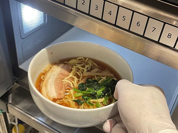 スープをお湯で溶き、麺を入れてレンジで加熱すれば完成です。