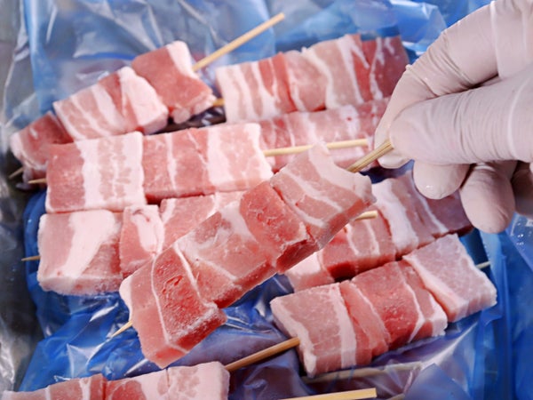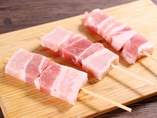 厚切りスライスした豚バラ肉をカットして、約3枚を15cm串で打ちました。豚バラの脂身や形状は一定ではありません。