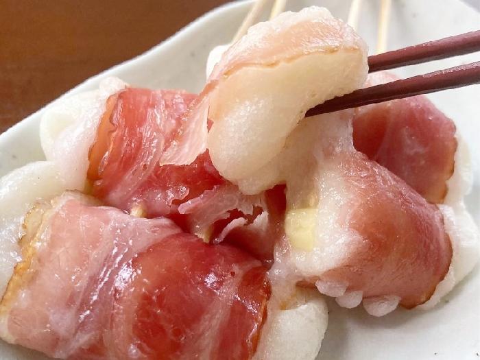 つき立ての柔らかなお餅をチーズで包み、ベーコンで巻きました。お好みで刻み海苔や醤油をかけると、一層美味しく召し上がれます。