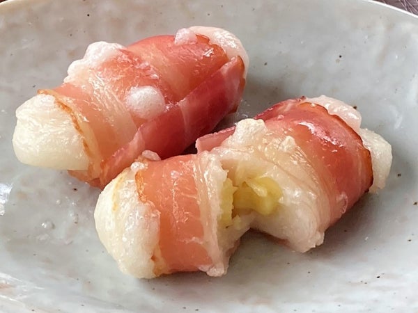 つき立ての柔らかなお餅をチーズで包み、ベーコンで巻きました。お好みで刻み海苔や醤油をかけると、一層美味しく召し上がれます。