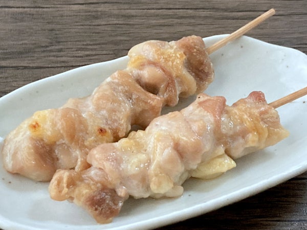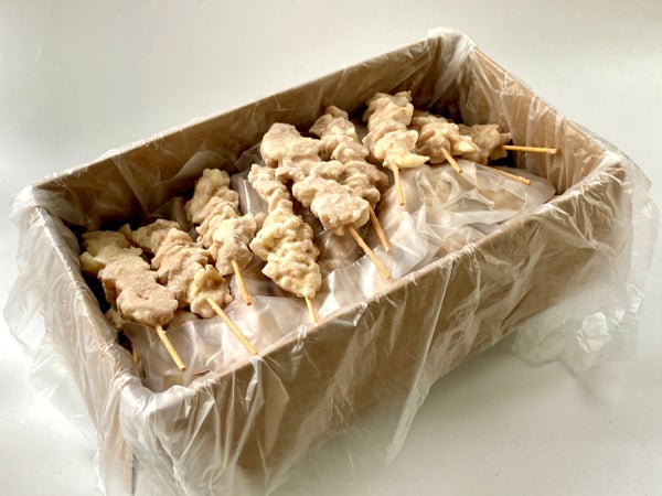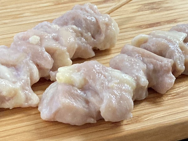 中国産の鶏もも肉に柔らか加工し、15cm丸串を打ってスチーム加工しました。現地工場で加工したものを輸入しています。
