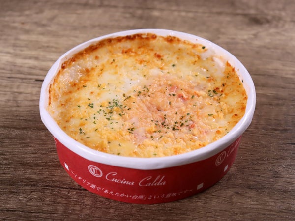 米(国産)、牛乳、ナチュラルチーズ(ゴーダ、ステッペン、モッツァレラ、パルメザン)、野菜(たまねぎ、黄ピーマン、赤ピーマン)、ホワイトソース(クリーム、牛乳、小麦粉、バター、砂糖、食塩、香辛料)、植物油脂、乳等を主要原料とする食品、小麦粉、バター、べにずわいがに、かまぼこ、チキンエキス、食塩、オニオンソテー、砂糖、ほたてエキス、パン粉、マーガリン、油脂加工品、加工油脂、チーズ加工品、香辛料、ゼラチン、パセリ、かにエキス、ミルポアペースト、ミルク風味パウダー/増粘剤(加工でん粉、キサンタン)、調味料(アミノ酸等)、乳化剤、加工でん粉、炭酸Ca、着色料(紅麹、カロチノイド)、香辛料抽出物、香料、(一部にかに・小麦・卵・乳成分・大豆・鶏肉・ゼラチンを含む