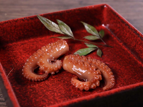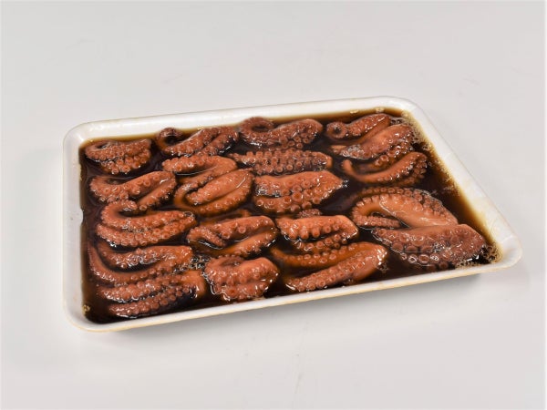 岩だこの足を甘めの醤油ダレで味付けしました。2本ずつにカットしてあるので一定の盛り付けができます。