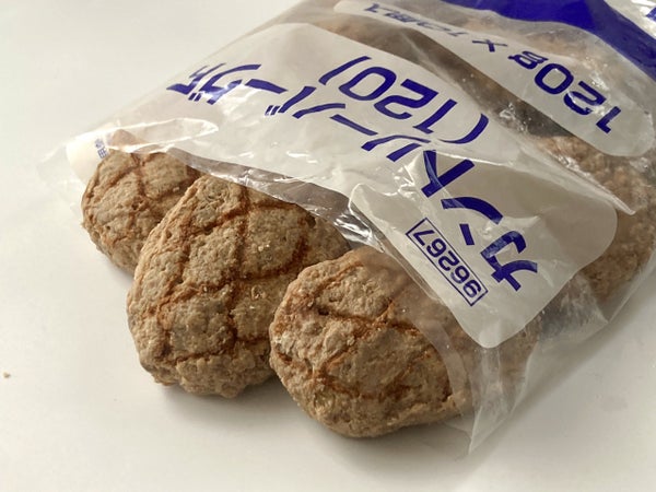 鶏肉主体の合挽き。バラ凍結なので使いやすさが抜群です。網状の焼き目がついています。