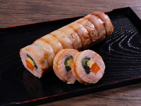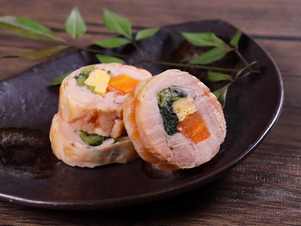 若鶏もも肉で菜の花・にんじん・玉子焼を巻き込み、照焼風のタレ付けをした八幡巻きです。