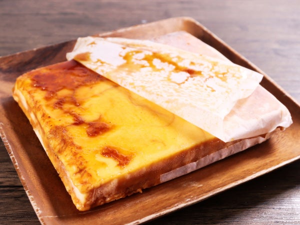 表面に砂糖をまぶしてバーナーで焦がしてあり(キャラメリゼ)、カリカリ・シャリシャリした甘苦いカラメルを感じることができます。炙りなおすとパリパリ感が戻ります。