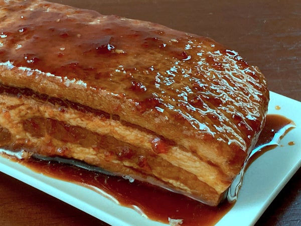 豚バラ肉、しょうゆ、糖類(黒砂糖・果糖ぶどう糖液糖・上白糖)、酒、米発酵調味料、食塩、香辛料、酵母エキス/リン酸塩(Na)、調味料(アミノ酸等)、増粘多糖類、(一部に小麦・卵・豚肉・大豆を含む)