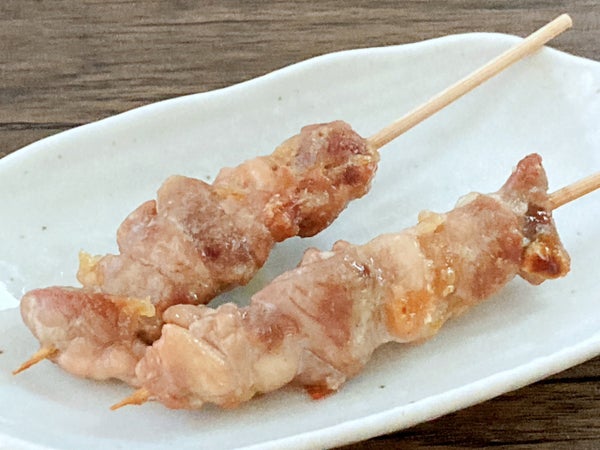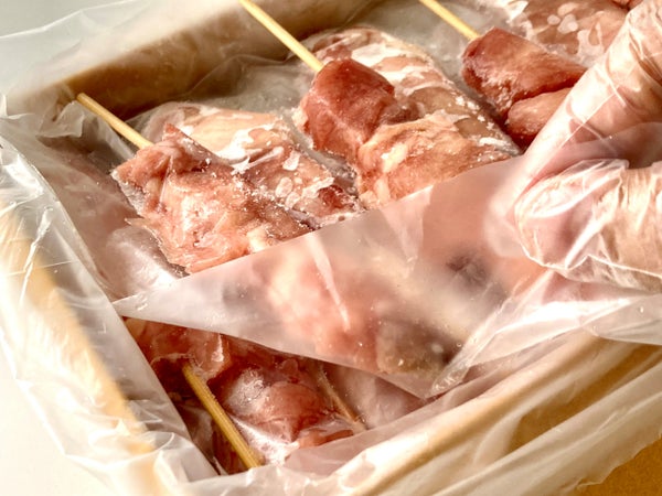 タイ産の鶏もも肉を15cm丸串で打ちました。現地工場で加工したものを輸入しています。