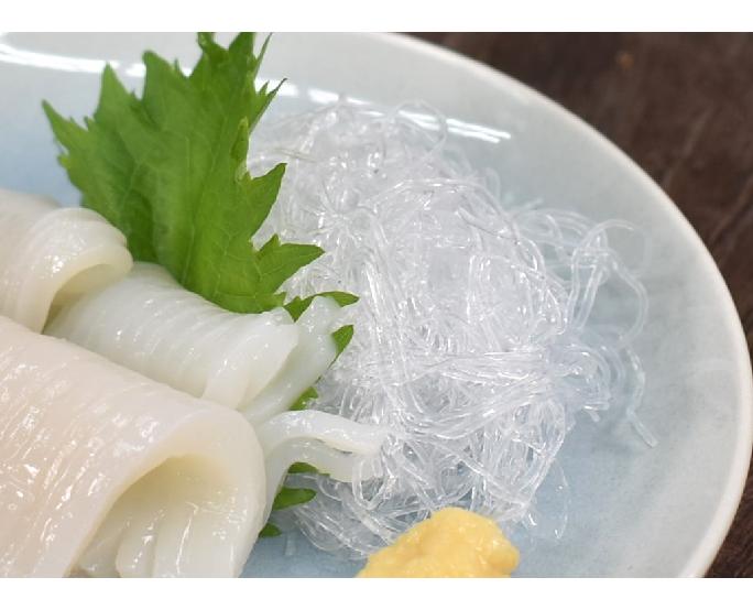 海藻抽出成分で作った、きらきらと透明感のある麺です。プチプチとした食感が特徴です。