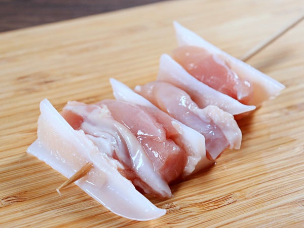 4個のヤゲンの間に鶏もも肉を刺しています。15cm串。(原料個体差によって大きさや形にはばらつきがあります。)