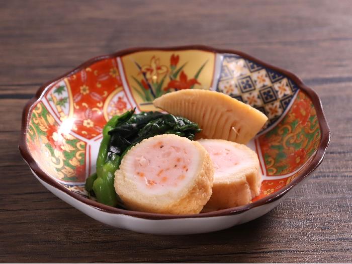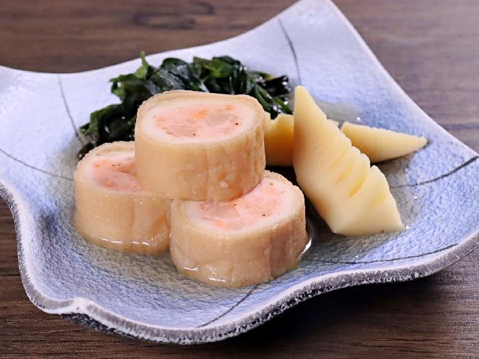桜えびと筍を入れたイトヨリダイすり身生地を油揚げで巻いて、出汁で下味をつけた信田巻きです。カットしてそのままお使いいただけます。衣をつけて天ぷらにしても◎、人気の季節感演出できる商品です。
