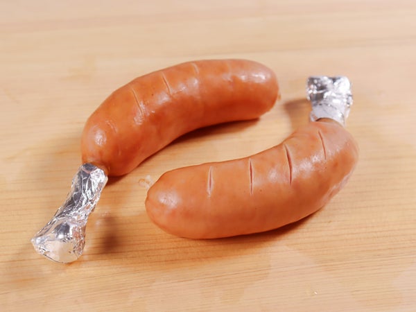 粗挽きポークフランクに骨を付け銀紙を巻きました。