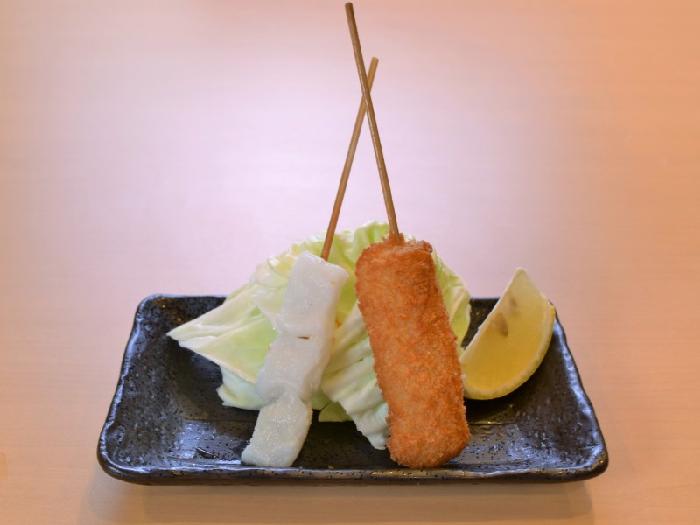 肉厚のイカを串に刺し、手作業で極細目のパン粉をつけました。関西風の薄衣仕上げです。