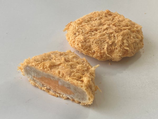 鶏・豚挽き肉のメンチの中に、加熱しても固まりにくいとろ~りなめらかな卵黄風フィリングを包み込みました。