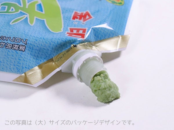 口栓つきパック。少し太めなので、刺身皿に直接絞り出すより、箸や指にとって添えていただくのがよいでしょう。