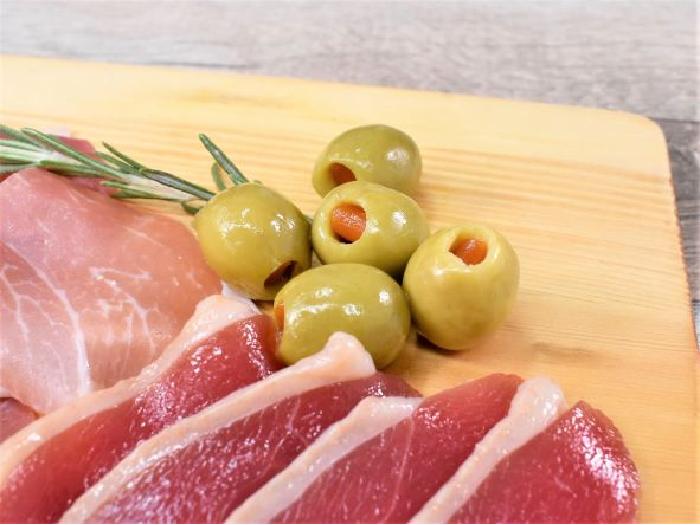オリーブ、赤ピーマン、漬け原材料(食塩)/塩化Ca、糊料(アルギン酸Na、グァーガム)、酸味料、酸化防止剤(ビタミンC)