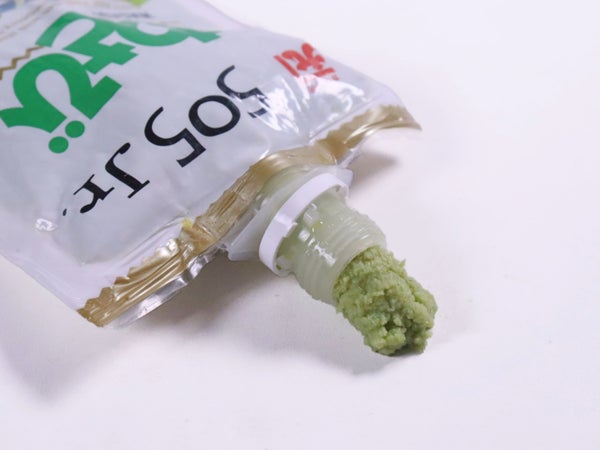 口栓つきパック。少し太めなので、刺身皿に直接絞り出すより、箸や指にとって添えていただくのがよいでしょう。