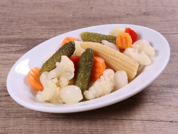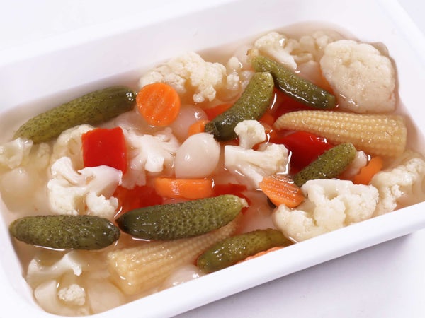 野菜[きゅうり、カリフラワー、たまねぎ、赤ピーマン、にんじん、ベビーコーン(遺伝子組換えでない)]、漬け原材料[醸造酢、砂糖、食塩]/香料、酸化防止剤(亜硫酸塩)