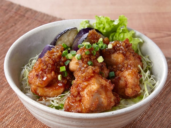 「唐揚げと揚げなすの油淋鶏丼」 具材入りなので材料も少なく、仕込む手間と提供する手間を軽減できます。