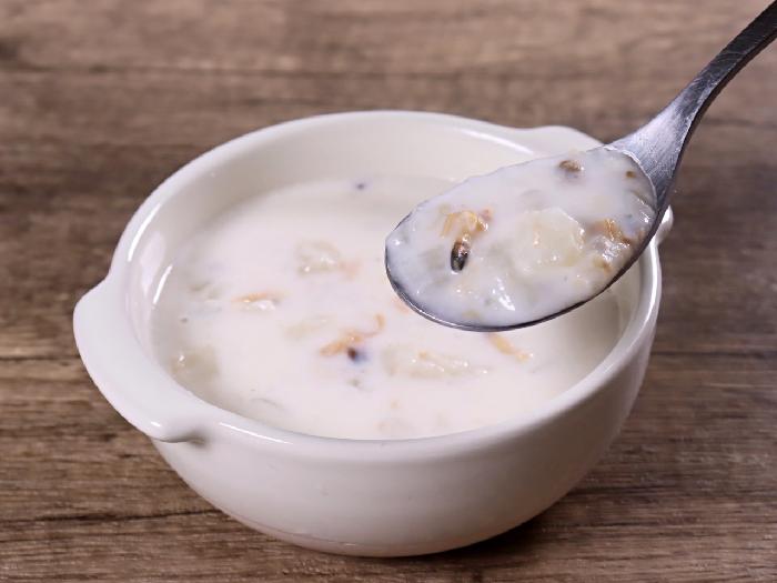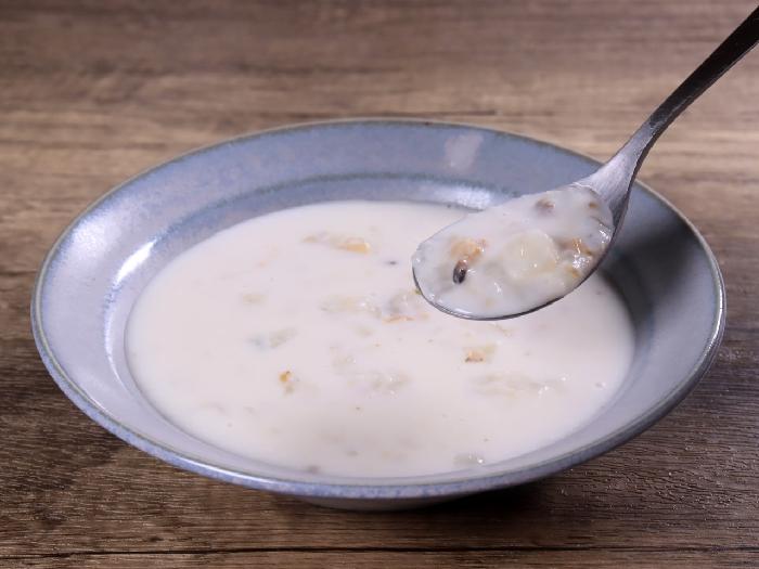 野菜(玉ねぎ・じゃがいも・パセリ)、あさり、乳等を主要原料とする食品、米、小麦粉、食塩、アサリエキス、粉末コンソメ、砂糖、植物油脂、バター、魚介粉末ブイヨン、香辛料/調味料(アミノ酸等)、香料、カラメル色素、酸味料、増粘剤(キサンタンガム)、(一部に乳成分・小麦・牛肉、大豆、鶏肉、ゼラチンを含む)