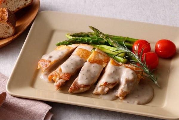 「チキンソテー トリュフ入りクリームソース」トリュフ入りきのこペーストをクリームソースに加えて高級感のあるソースに仕上げました。トリュフの香りと、カリッと焼けたチキンソテーがおいしい一皿です。