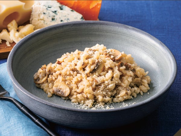 「トリュフ香るチーズリゾット」チーズの濃厚さとトリュフの香りで高級感のある一皿に。さらに上から粉チーズをかけるのがおすすめです。