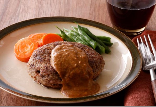 「トリュフデミハンバーグ」シンプルなデミグラスソースにトリュフ入りキノコペーストを加えて香りをプラスしました。生クリームを加えるとトリュフが一層引き立ちます。