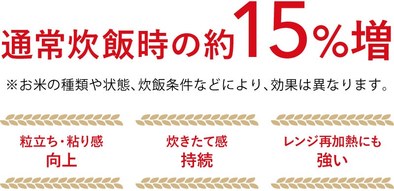 お米が水をいつもより多く抱きかかえるため、通常の水加減で炊飯した時より、約15%炊きあがりが多くなります。