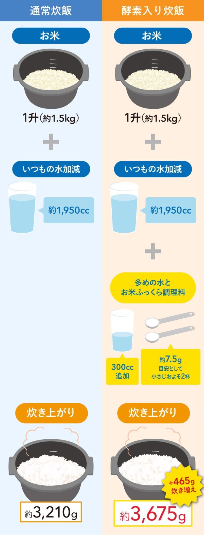 「お米ふっくら調理料」はごはんが「炊き増え」する酵素製剤です。水加減を通常より約20%増やして炊飯しますがおいしさそのまま、酵素の作用でふっくら炊きあがります。