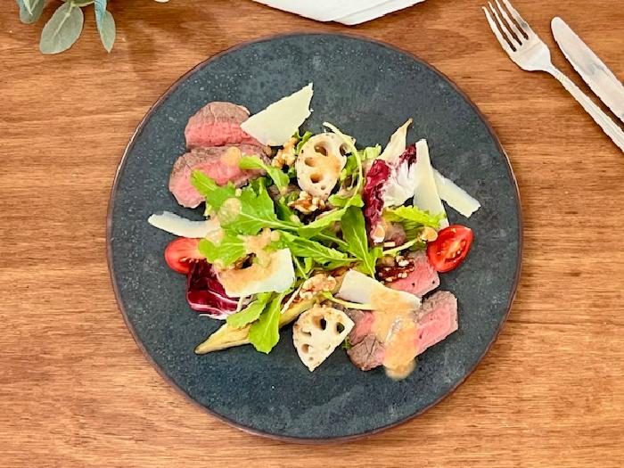 洋食屋さんで食べるお店のすりおろし野菜ドレッシング=すりおろした玉ねぎ・にんじん・にんにくの風味や食感と、卵黄のコクが特徴のドレッシングです。「味づくりに必要な分だけのお酢と食塩」「手作りに近い乳化」で酸味が少なくフレッシュな味なのに濃厚な風味を両立したドレッシングです.。