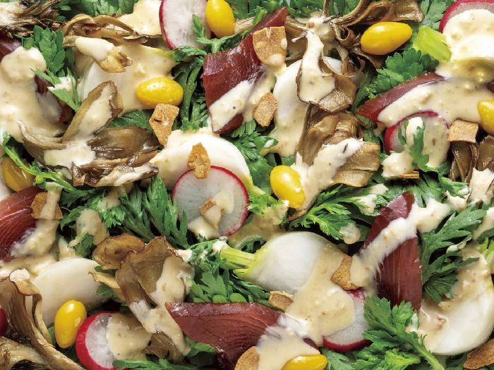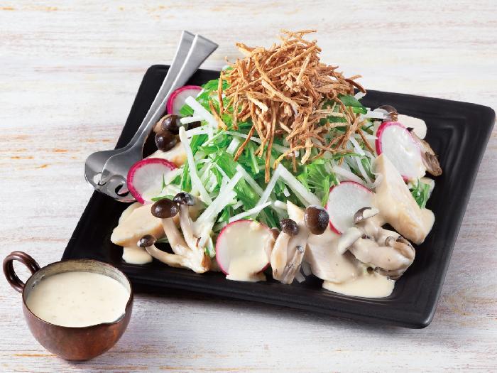 しょうがの香味が効いた、素材にしっかりからむクリーミィタイプのドレッシングです。みそを配合したコクのある味わいで、さまざまなメニューにご使用いただけます。