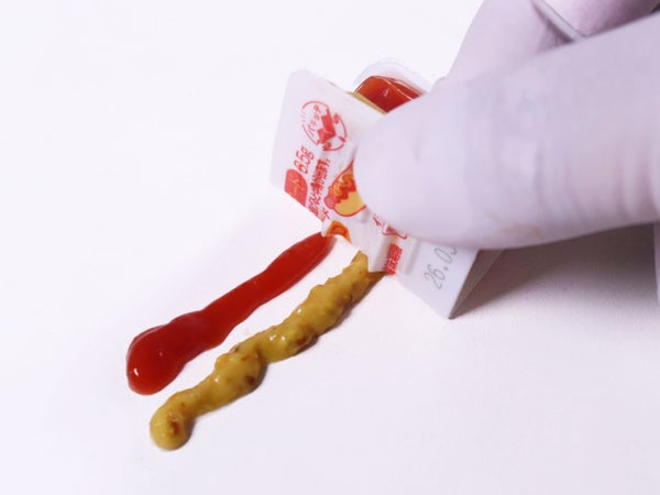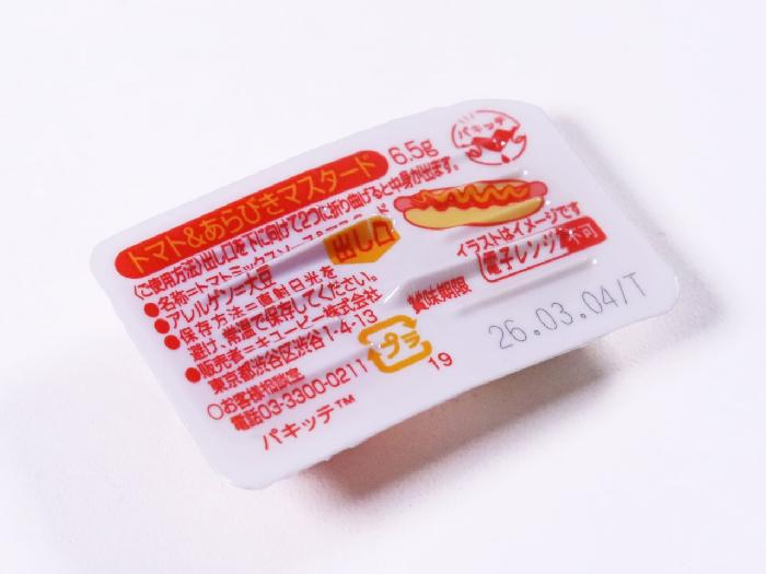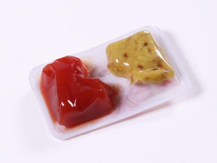 トマトミックスソースとあらびきマスタードをセットにしてパックしました。1個内容量は6.5g。