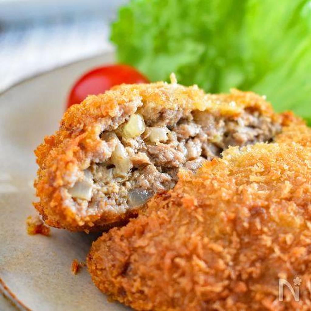 食肉〔牛肉(オーストラリア)、豚肉〕、たまねぎ、粒状植物性たん白、液卵白、パン粉、豚脂、ゼラチン、粗ゼラチン、食塩、小麦粉、香辛料、衣[パン粉、フライミックス粉(小麦粉、でん粉、粉あめ、その他)、植物油脂、コーンフラワー、フライミックス粉(小麦粉、乾燥卵白、食塩、でん粉)、コーングリッツ]/焼成Ca、着色料(カロテノイド、カラメル)、膨張剤、調味料(アミノ酸)、乳化剤、(一部に小麦、卵、乳成分、牛肉、大豆、豚肉、ゼラチンを含む)