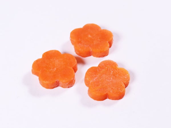 花の形をかたどった愛らしいにんじんです。春はもちろん年間を通じて、料理に文字通り花を添えます。にんじんはあまり冷凍に向かない野菜ですが、約0.8mmの薄めにスライスし急速冷凍することによって食感を保つようにしています。また、事前解凍をしないで直接加熱料理に使用するのがおいしく調理するポイントです。