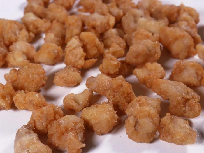 鶏軟骨(ブラジル産)、しょうゆ、衣[でん粉、食塩、米粉、小麦粉、糖類(砂糖、ぶどう糖)、脱脂粉乳、粉末醤油、植物たん白加水分解物、植物性たん白、大豆粉、酵母エキス]、揚げ油(食用大豆油、食用なたね油)/加工澱粉、調味料(アミノ酸等)、ベーキングパウダー、カロチノイド色素、増粘多糖類、甘味料(甘草)、(一部に小麦・乳成分・大豆・鶏肉を含む)
