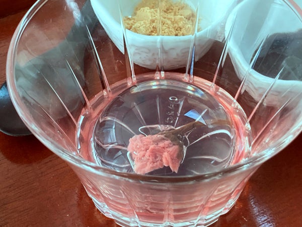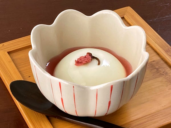 黒蜜を桜ソースに置き換え。わらび餅の透明感によく合います。