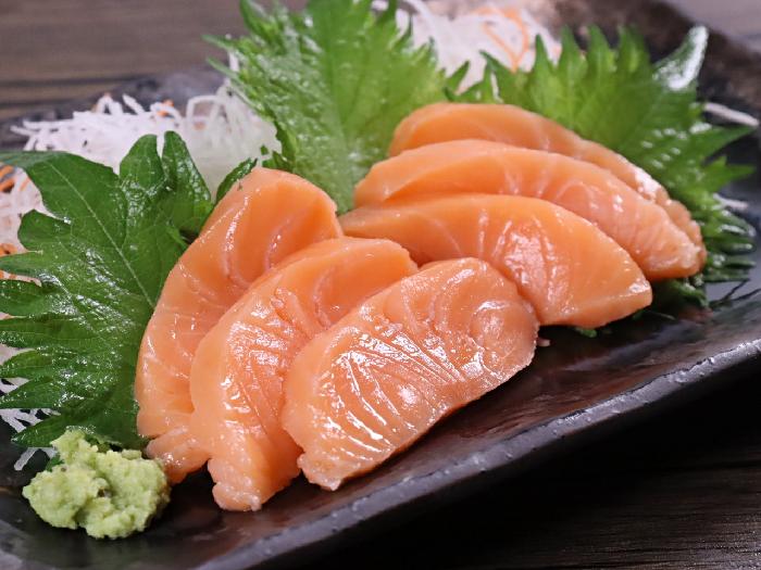 アトランティックサーモンは淡い色合い。しっとりみずみずしく、じんわり脂のにじむサーモン刺身が提供できます。
