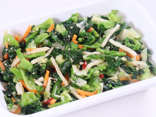 菜の花(中国産)、キャベツ、人参、竹の子、精製アミノ酸液(植物性たん白質(大豆を含む)、食塩)、キヌサヤ、還元澱粉糖化物、ごま、昆布調味料、香辛料、かつお節粉末/調味料(アミノ酸等)