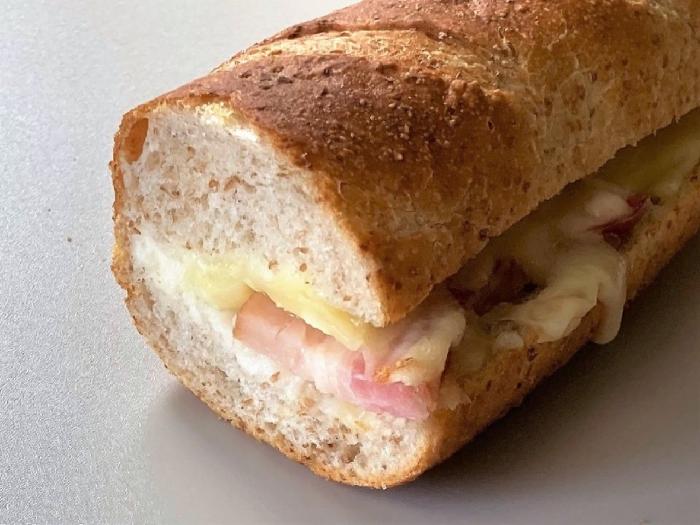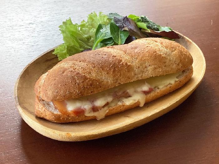 香ばしい香りのグラハムパンで、香りと旨みのあるベーコンとベシャメルソースを、チーズとともに挟みました。