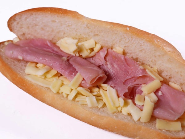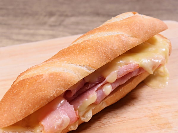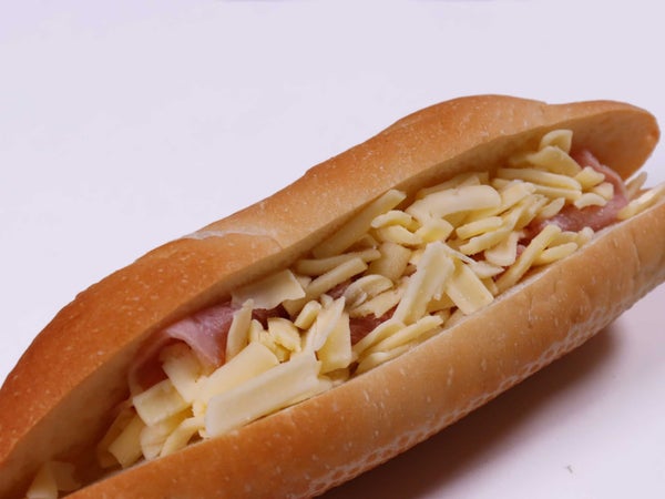 焼き皮が香ばしいバゲットのおいしさがシンプルに味わえます。こだわりのボンレスハムとこだわりチーズ(エグモント、NZゴーダ、Hゴーダ・サムソー)を挟んだバゲットサンドです。