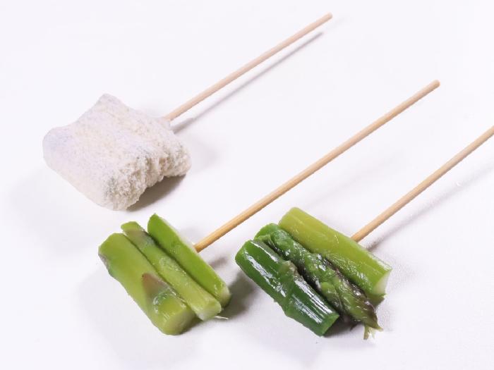 カットしたアスパラを串に刺し、国内の工場で丁寧にパン粉付けしました。